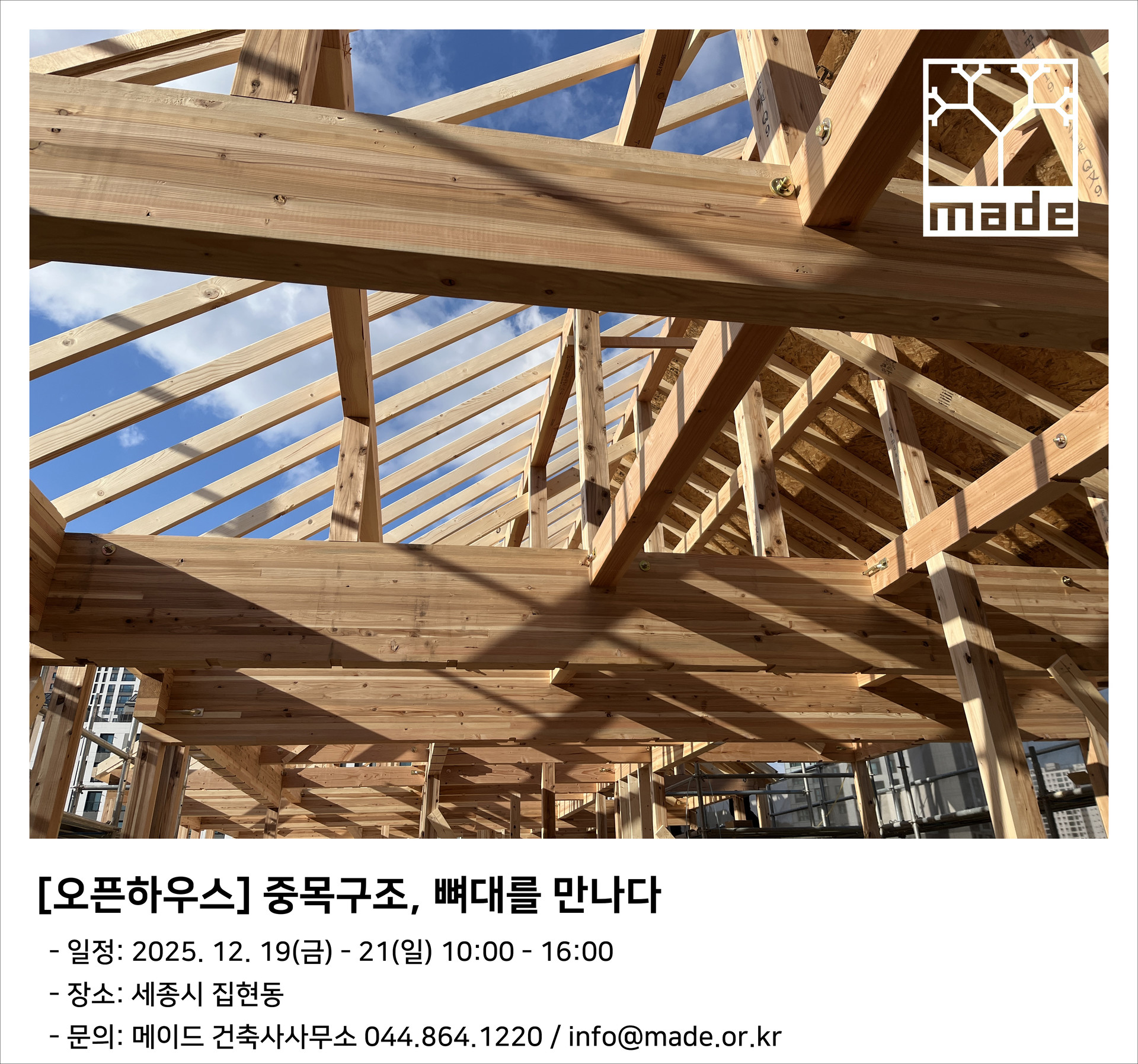 세종시 집현동에 지어지는 메이드 건축사사무소의 두번째 중목구조 단독주택 프로젝트. 나무가 주는 따뜻함과 공학적인 튼튼함이 만나는 그 현장으로 여러분들을 초대합니다. / 일정: 2025.12.19(금) - 21(일) 10:00-16:00 / 문의: 044.864.1220, info@made.or.kr
